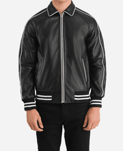 Versatile and universally appealing, this solid-color leather varsity jacket boasts meticulous detailing with twin-color ribbed hems and cuffs, accented by striking contrast borders along the seams and sleeves. Crafted from premium full-grain sheepskin leather, it ensures a comfortable fit with raglan sleeves for unrestricted movement. The innovative shirt-style collar introduces a modern twist to its classic varsity silhouette, making it a standout choice for individuals of diverse tastes and ages.